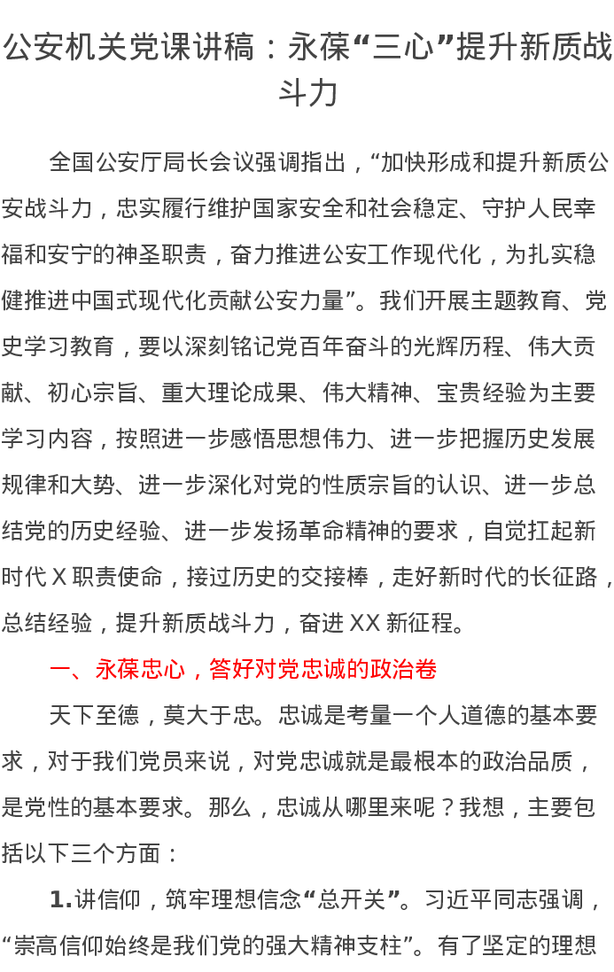 公安机关党课讲稿:永葆“三心”提升新质战斗力