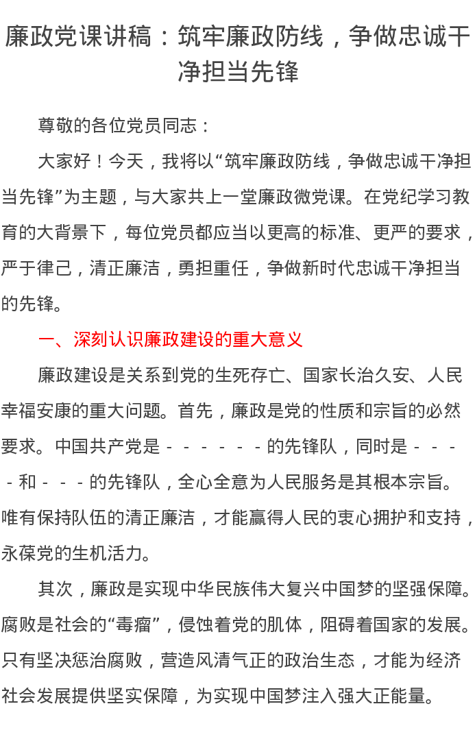 廉政党课讲稿:筑牢廉政防线,争做忠诚干净担当先锋