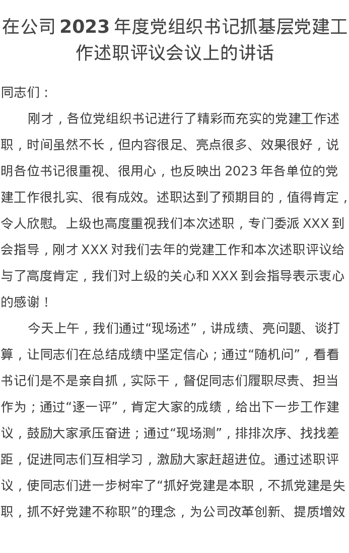 在公司2023年度党组织书记抓基层党建工作述职评议会议上的讲话