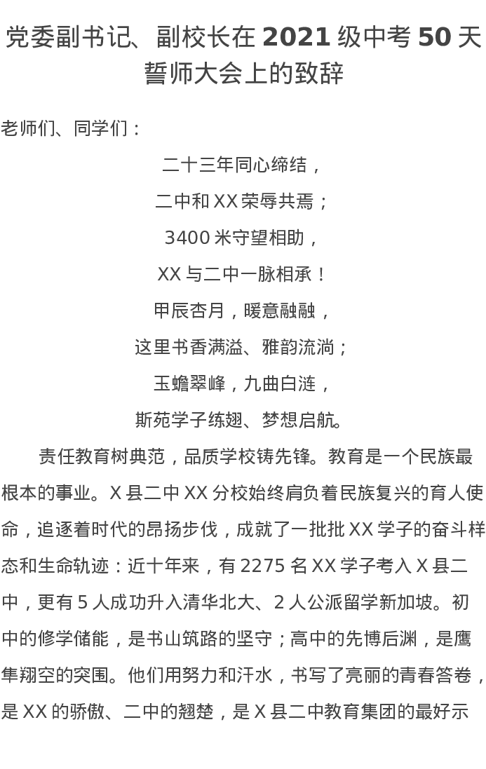 党委副书记、副校长在2021级中考50天誓师大会上的致辞