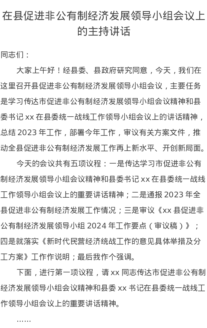在县促进非公有制经济发展领导小组会议上的主持讲话