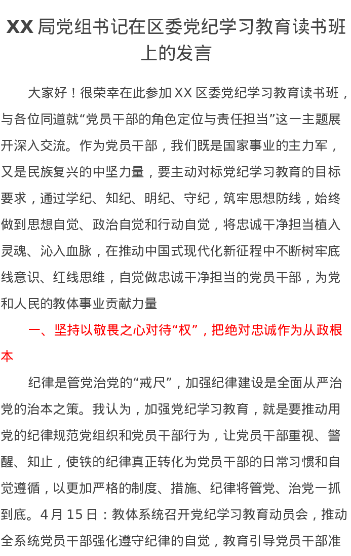 XX局党组书记在区委党纪学习教育读书班上的发言