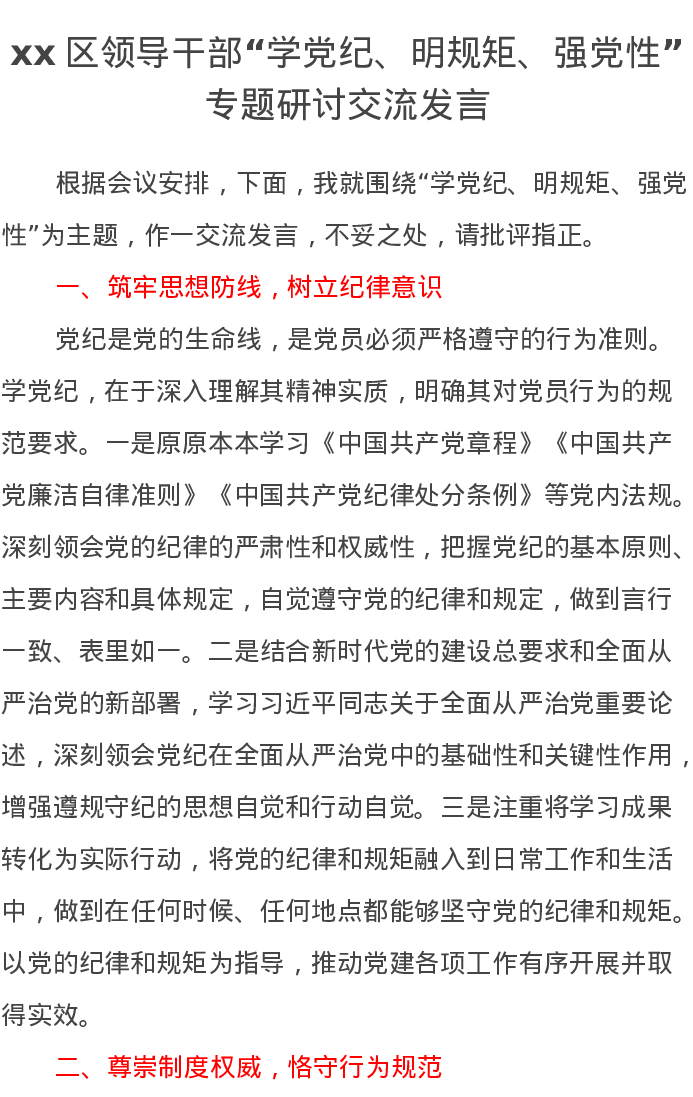 xx区领导干部“学党纪、明规矩、强党性”专题研讨交流发言