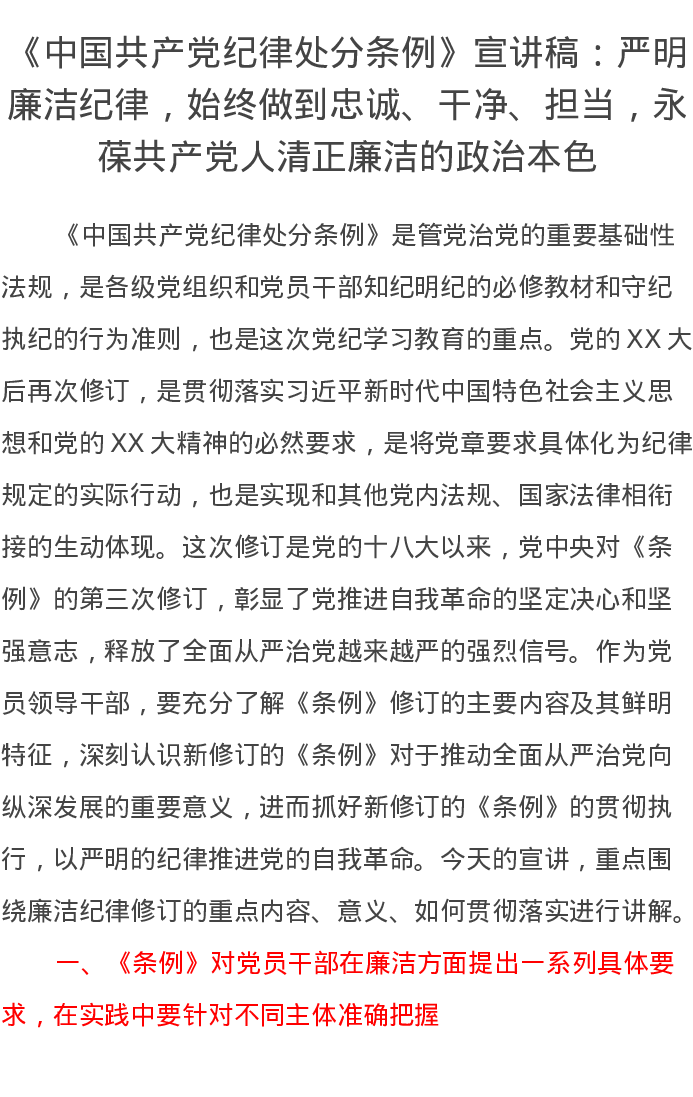《中国共产党纪律处分条例》宣讲稿:严明廉洁纪律,始终做到忠诚、干净、担当,永葆共产党人清正廉洁的政治本色