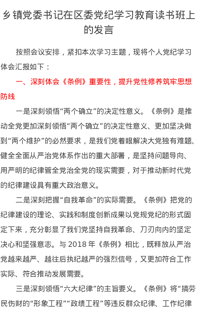 乡镇党委书记在区委党纪学习教育读书班上的发言