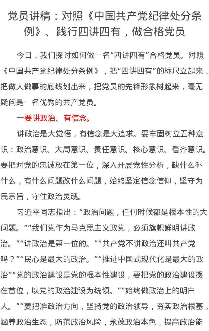 党员讲稿:对照《中国共产党纪律处分条例》、践行四讲四有,做合格党员