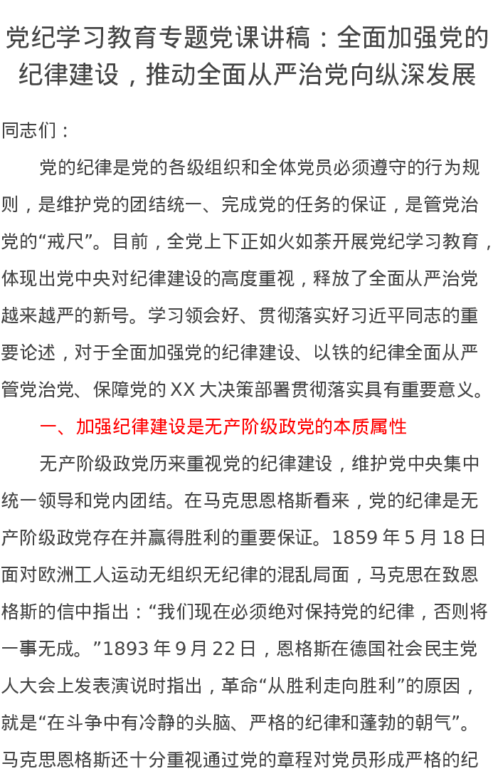 党纪学习教育专题党课讲稿:全面加强党的纪律建设,推动全面从严治党向纵深发展