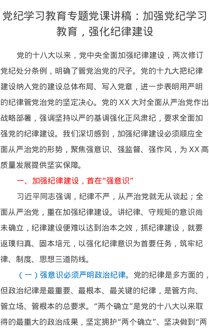 党纪学习教育专题党课讲稿:加强党纪学习教育,强化纪律建设