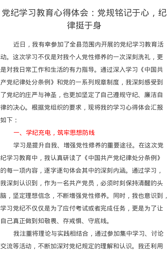 党纪学习教育心得体会:党规铭记于心,纪律挺于身