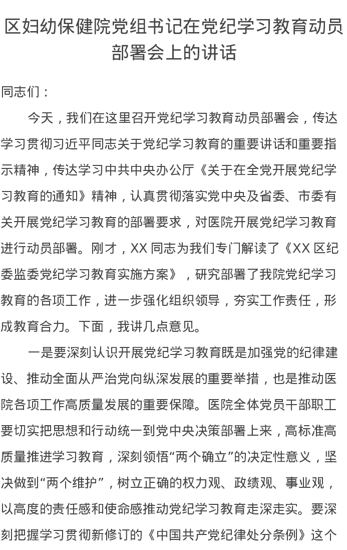 区妇幼保健院党组书记在党纪学习教育动员部署会上的讲话