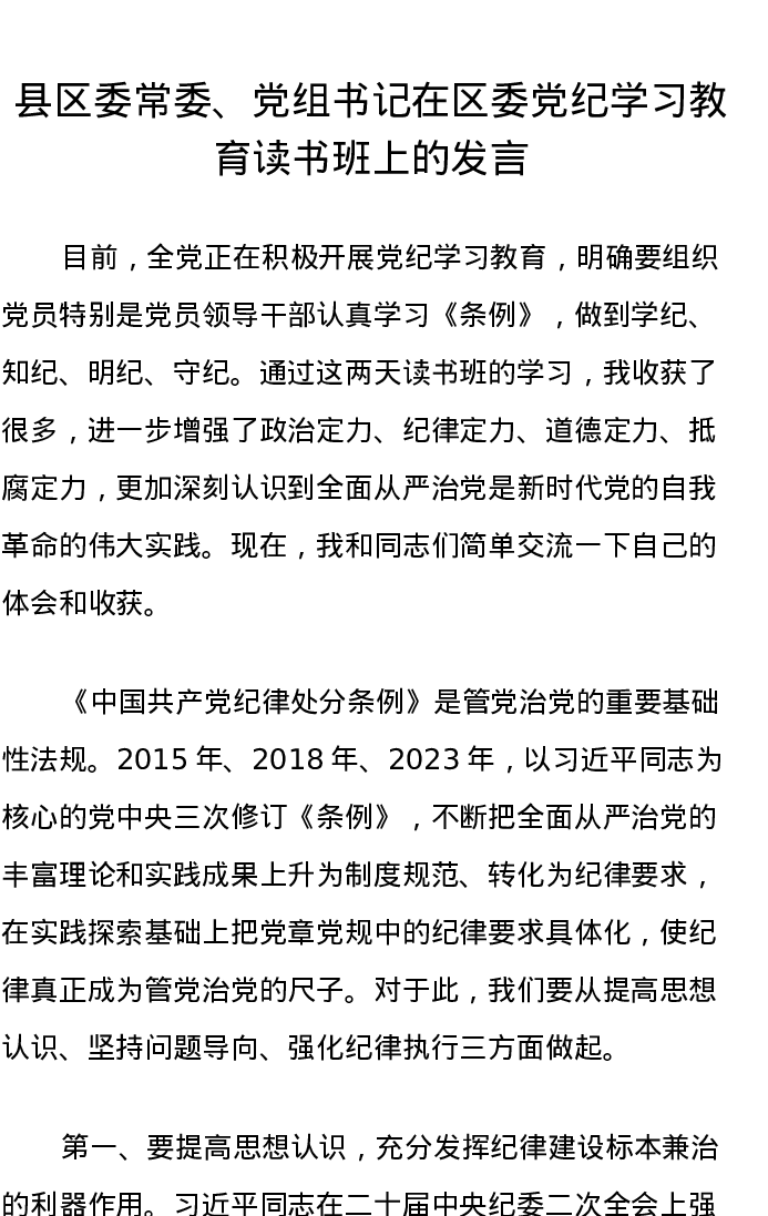 县区委常委、党组书记在区委党纪学习教育读书班上的发言