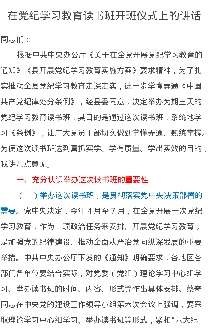 在党纪学习教育读书班开班仪式上的讲话