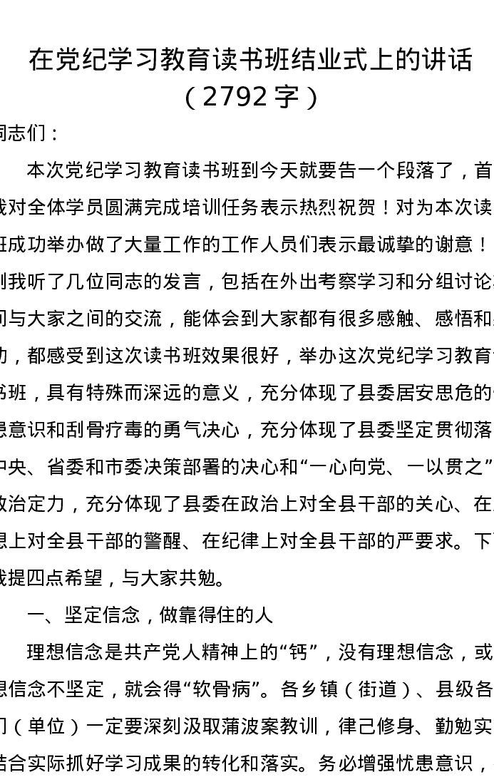 在党纪学习教育读书班结业式上的讲话