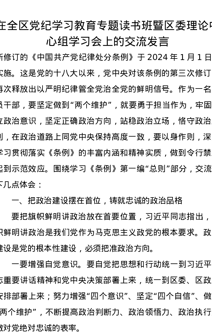 在全区党纪学习教育专题读书班暨区委理论中心组学习会上的交流发言