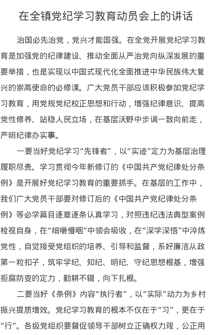 在全镇党纪学习教育动员会上的讲话