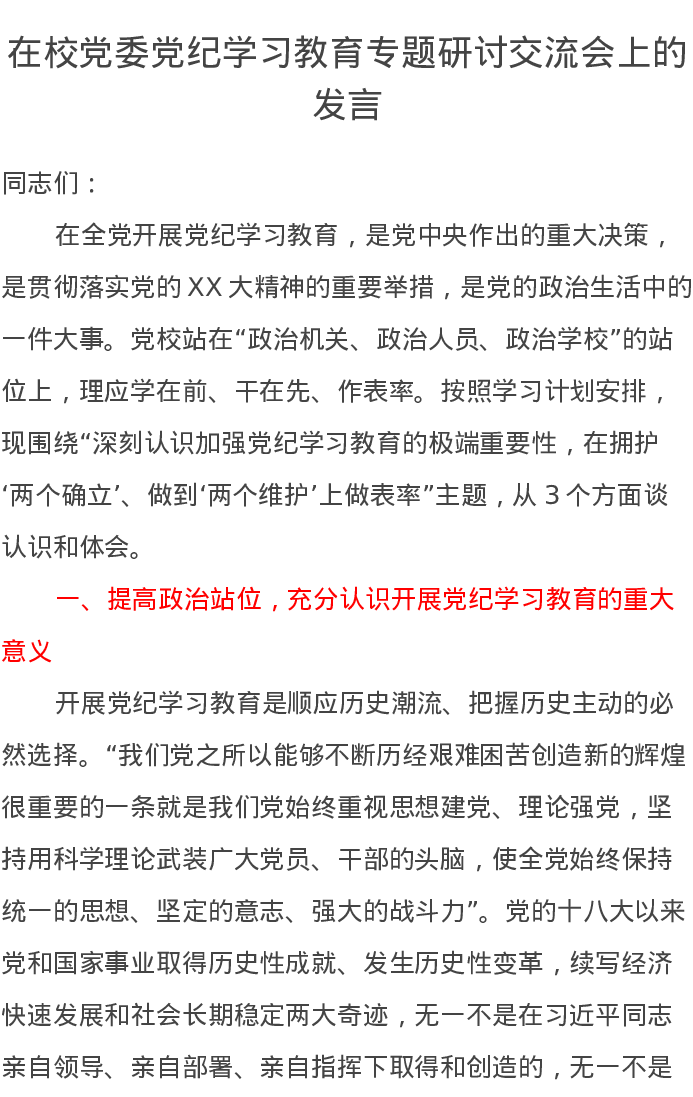 在校党委党纪学习教育专题研讨交流会上的发言