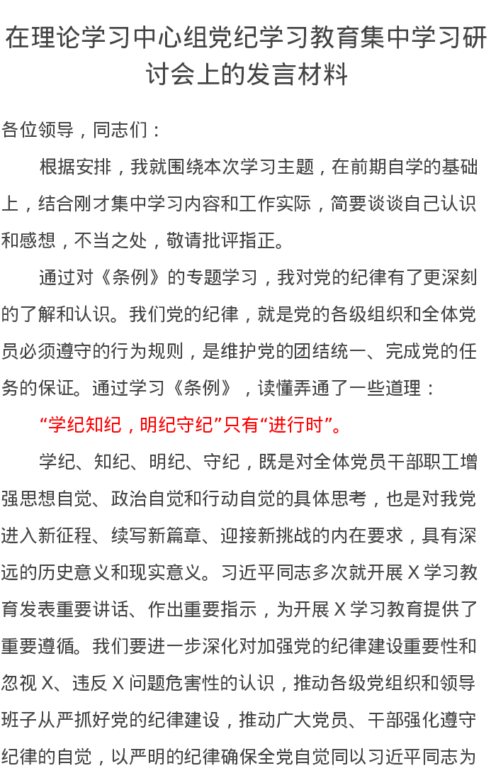 在理论学习中心组党纪学习教育集中学习研讨会上的发言材料(处分条例)