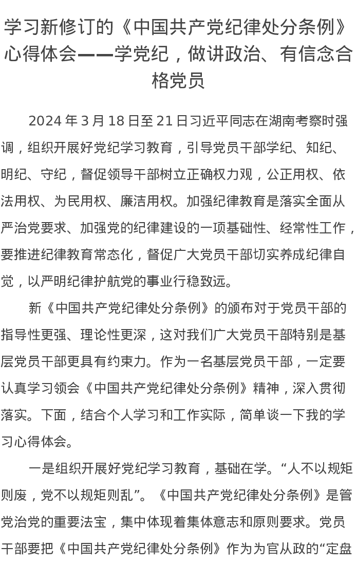 学习新修订的《中国共产党纪律处分条例》心得体会——学党纪,做讲政治、有信念合格党员