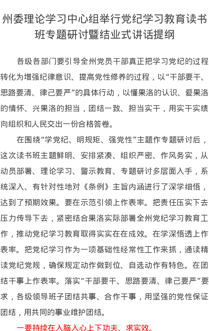 州委理论学习中心组举行党纪学习教育读书班专题研讨暨结业式讲话提纲