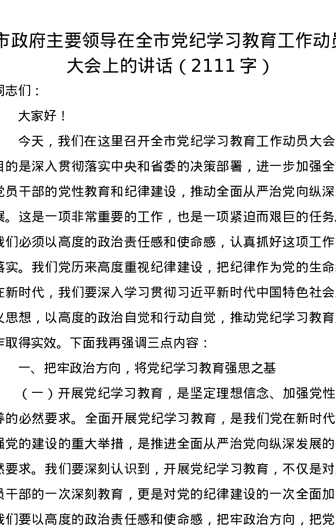 市政府主要领导在全市党纪学习教育工作动员大会上的讲话