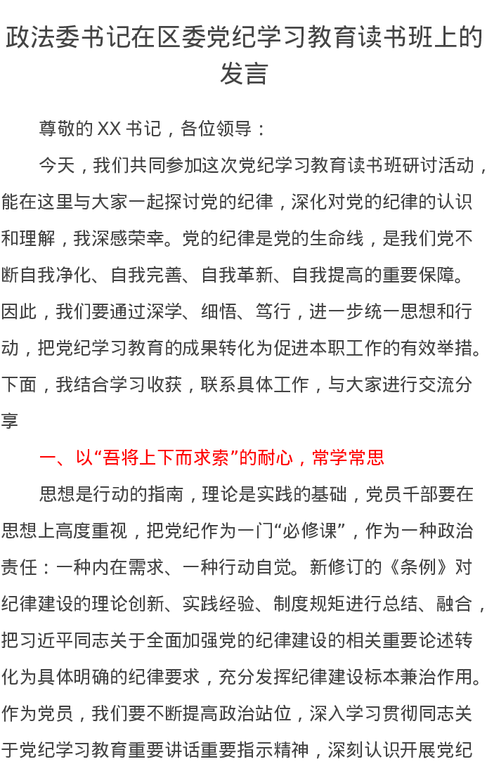 政法委书记在区委党纪学习教育读书班上的发言