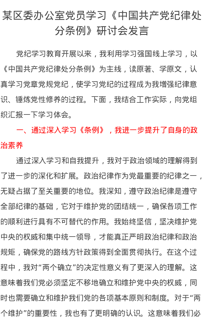 某区委办公室党员学习《中国共产党纪律处分条例》研讨会发言
