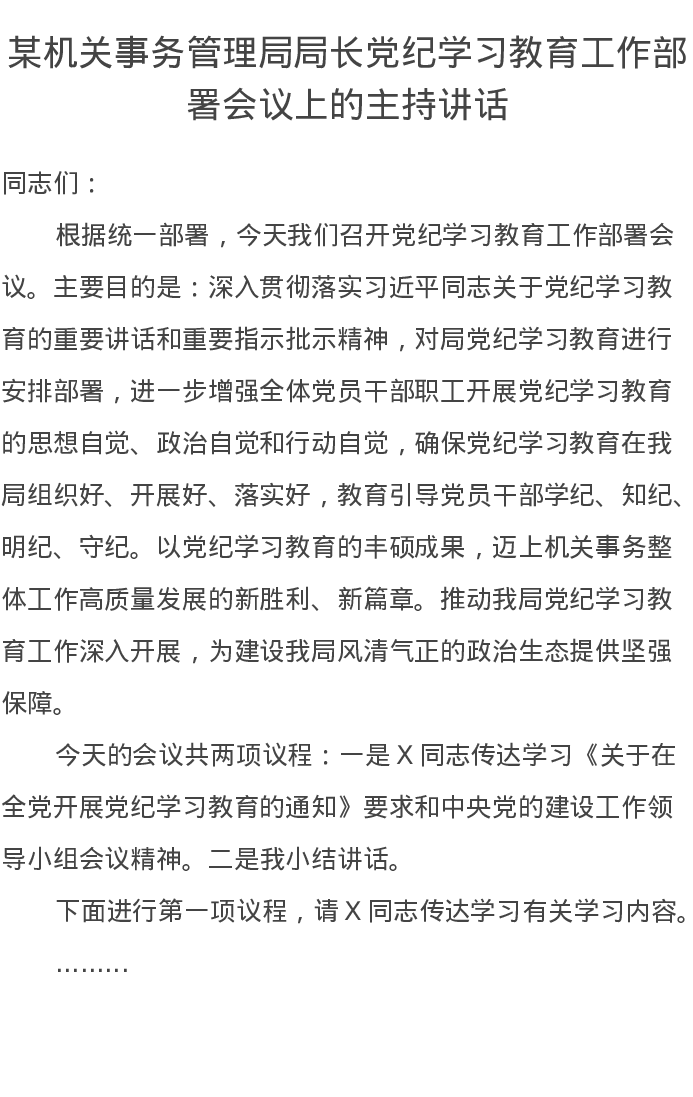 某机关事务管理局局长党纪学习教育工作部署会议上的主持讲话