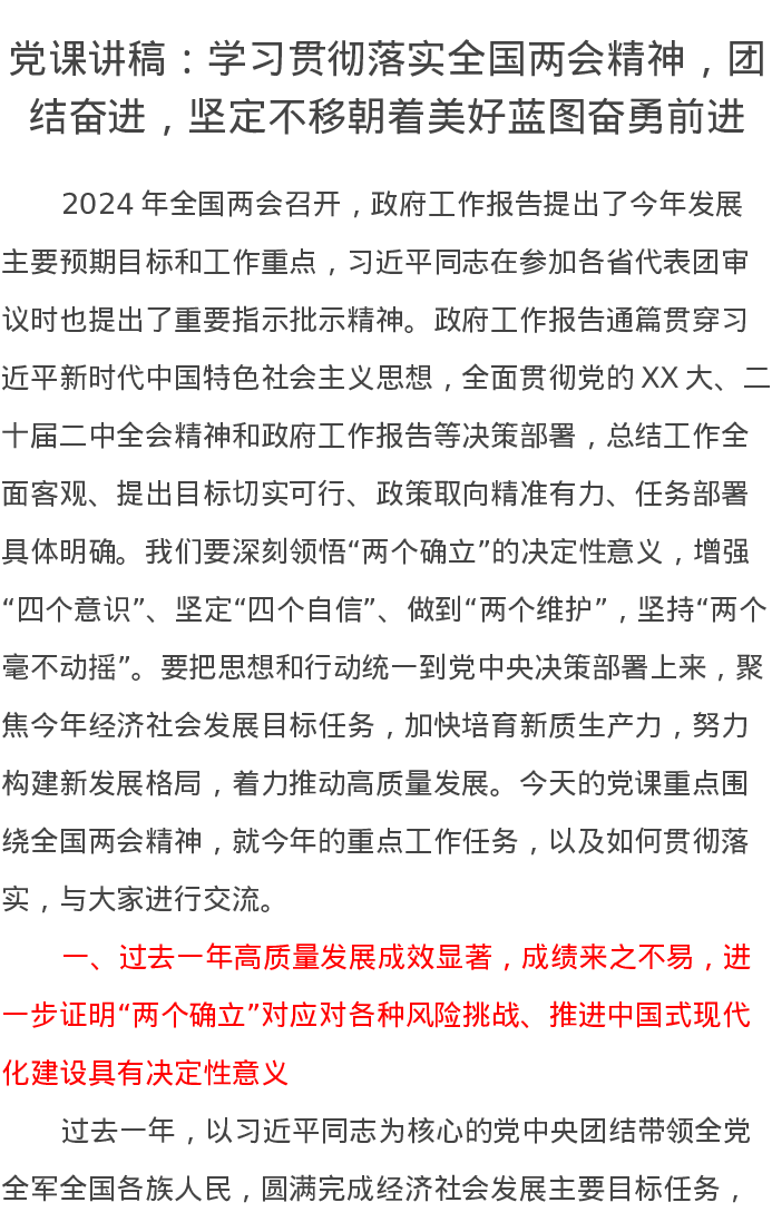 党课讲稿:学习贯彻落实全国两会精神,团结奋进,坚定不移朝着美好蓝图奋勇前进