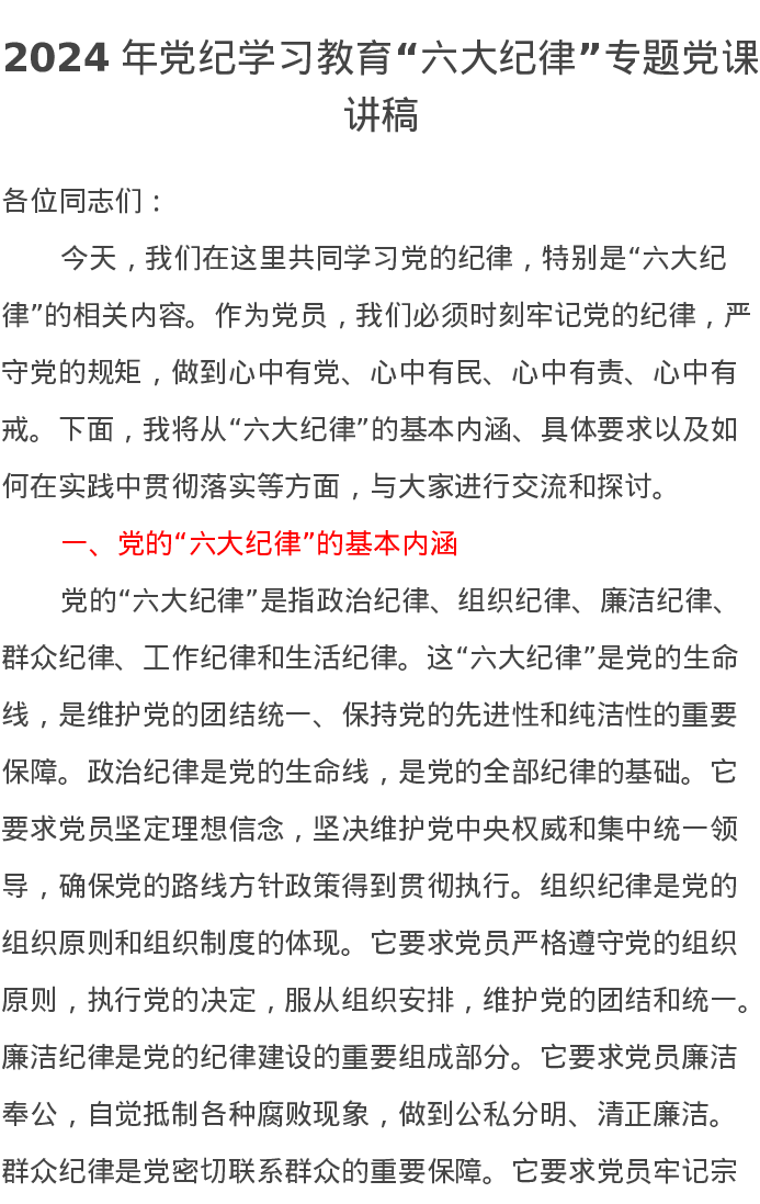 2024年党纪学习教育“六大纪律”专题党课讲稿