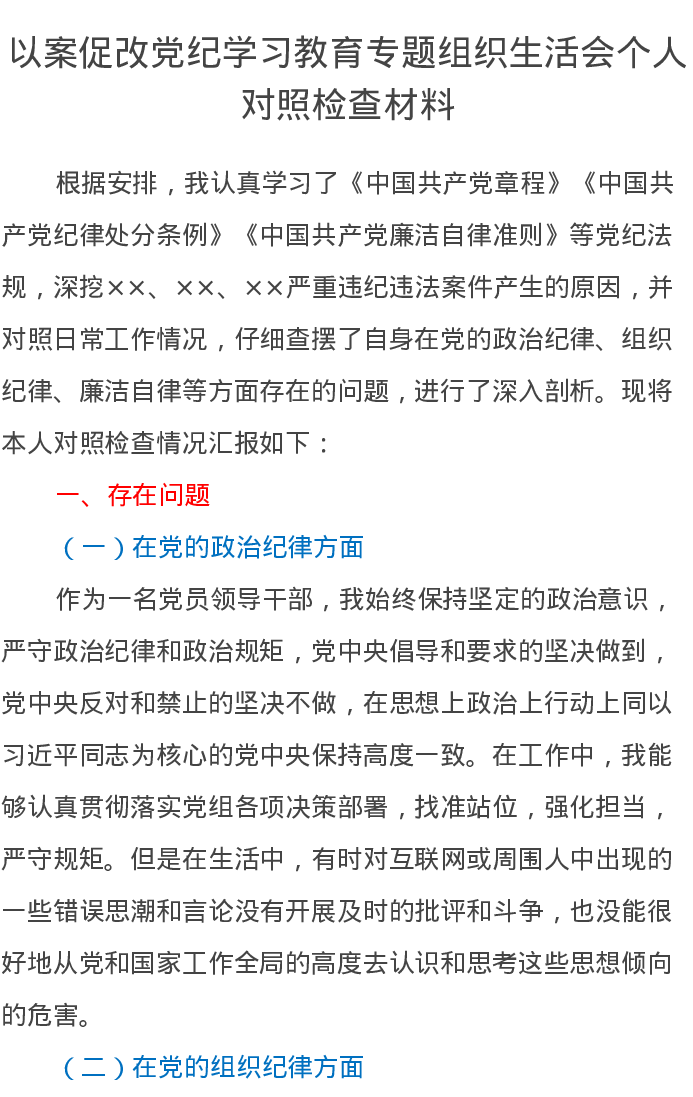 以案促改党纪学习教育专题组织生活会个人对照检查材料