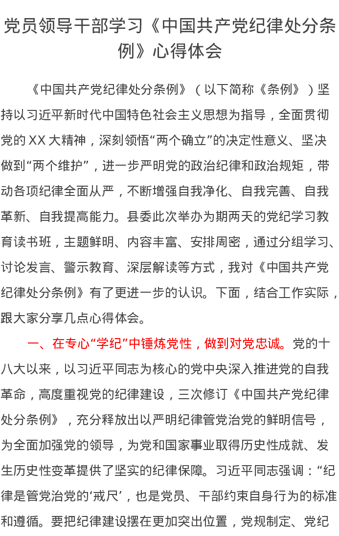 党员领导干部学习《中国共产党纪律处分条例》心得体会11