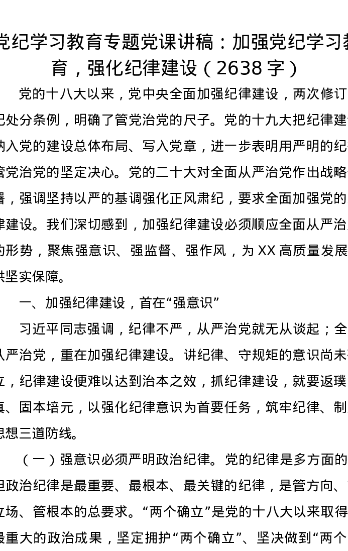 党纪学习教育专题党课讲稿:加强党纪学习教育,强化纪律建设