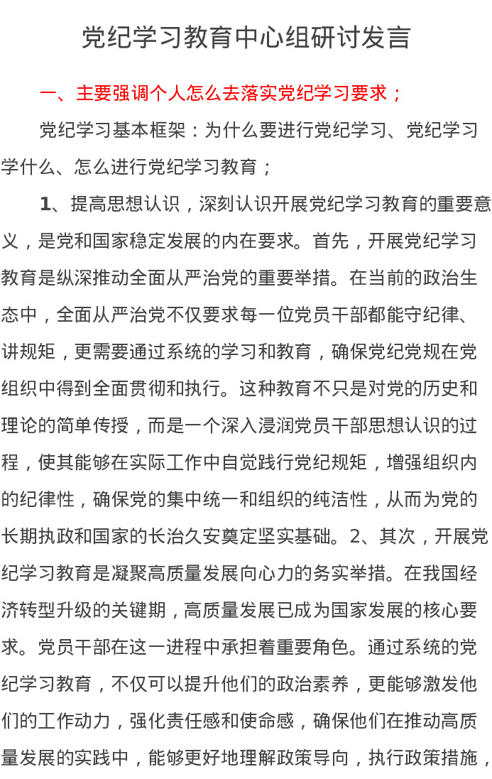 党纪学习教育中心组研讨发言