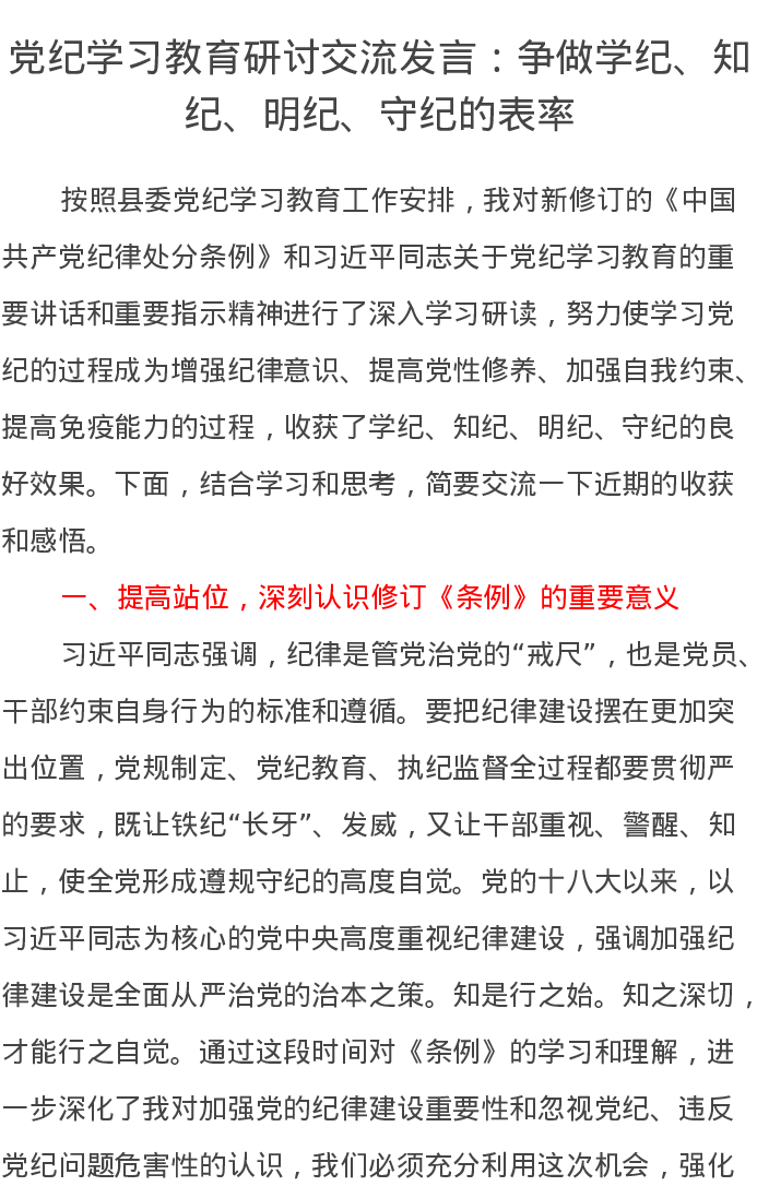党纪学习教育研讨交流发言:争做学纪、知纪、明纪、守纪的表率