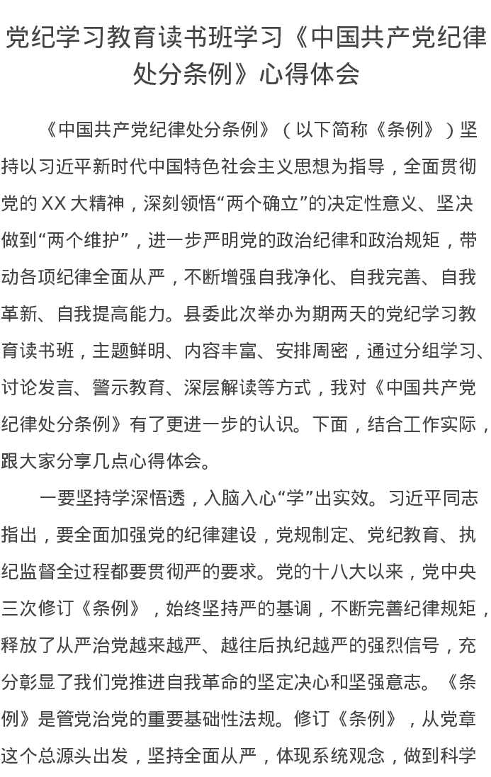 党纪学习教育读书班学习《中国共产党纪律处分条例》心得体会14