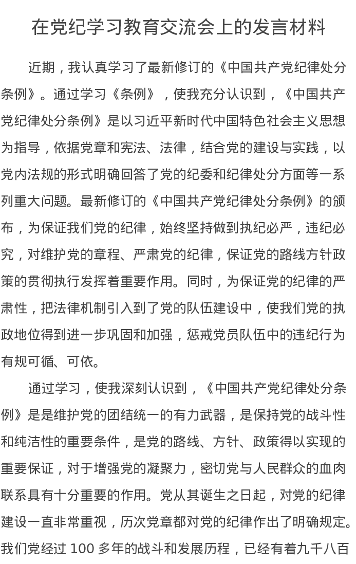 在党纪学习教育交流会上的发言材料8