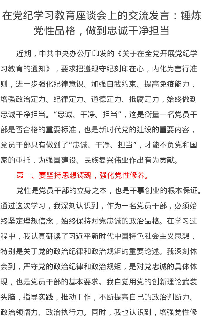 在党纪学习教育座谈会上的交流发言:锤炼党性品格,做到忠诚干净担当