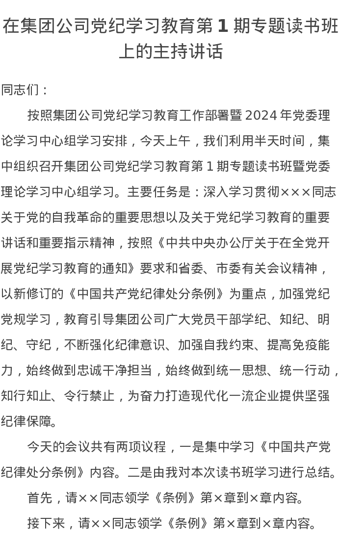 在集团公司党纪学习教育第1期专题读书班上的主持讲话