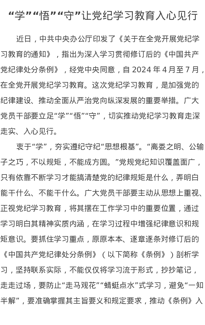 心得体会:“学”“悟”“守”让党纪学习教育入心见行