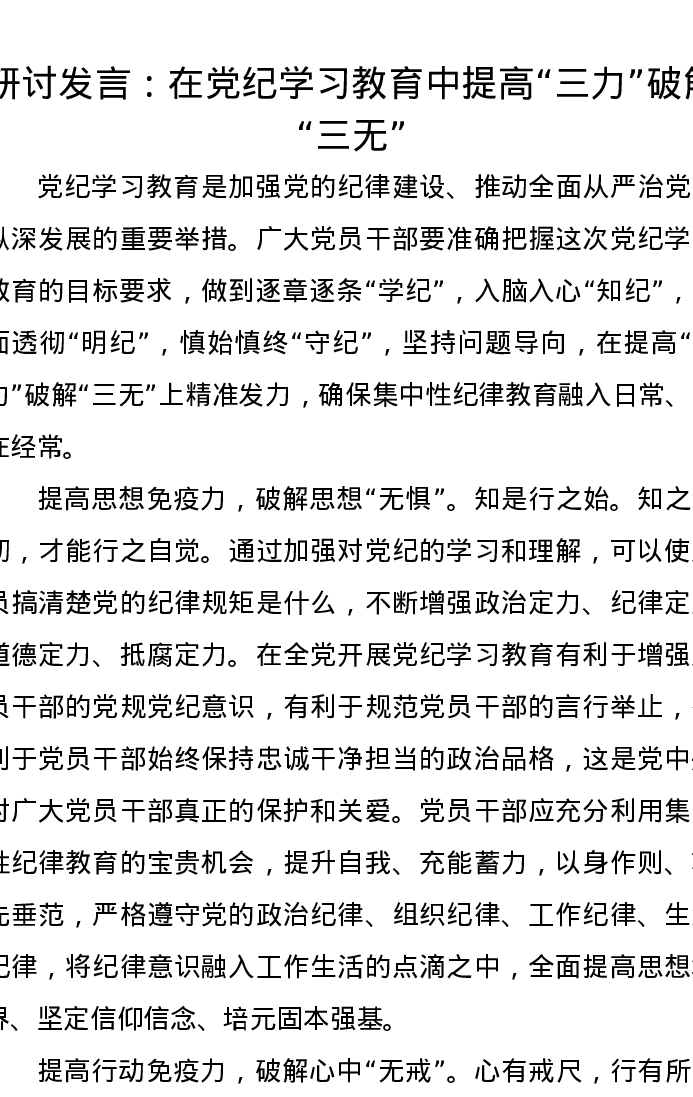 研讨发言:在党纪学习教育中提高“三力”破解“三无”