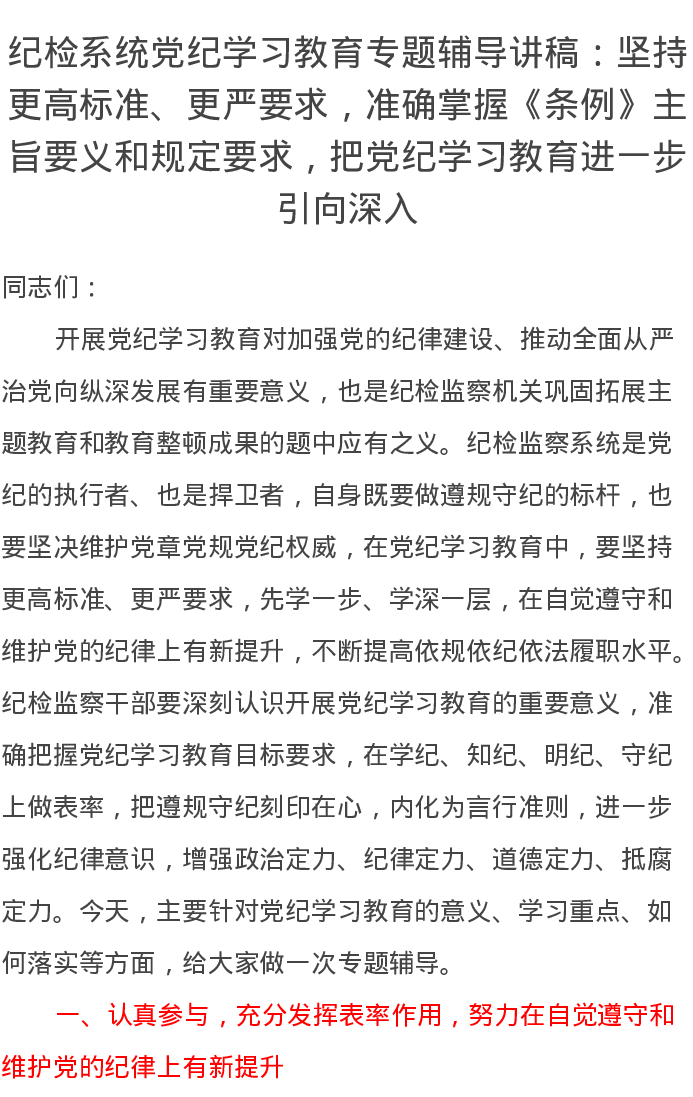 纪检系统党纪学习教育党课讲稿:坚持更高标准、更严要求,准确掌握《条例》主旨要义和规定要求,把党纪学习教育进一步引向深入