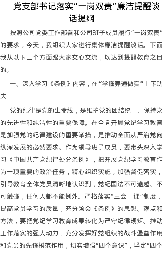 党支部书记落实“一岗双责”廉洁提醒谈话提纲