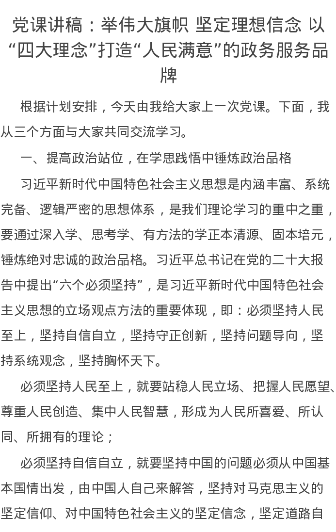 党课讲稿:举伟大旗帜 坚定理想信念 以“四大理念”打造“人民满意”的政务服务品牌