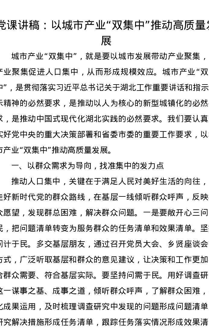 党课讲稿:以城市产业“双集中”推动高质量发展