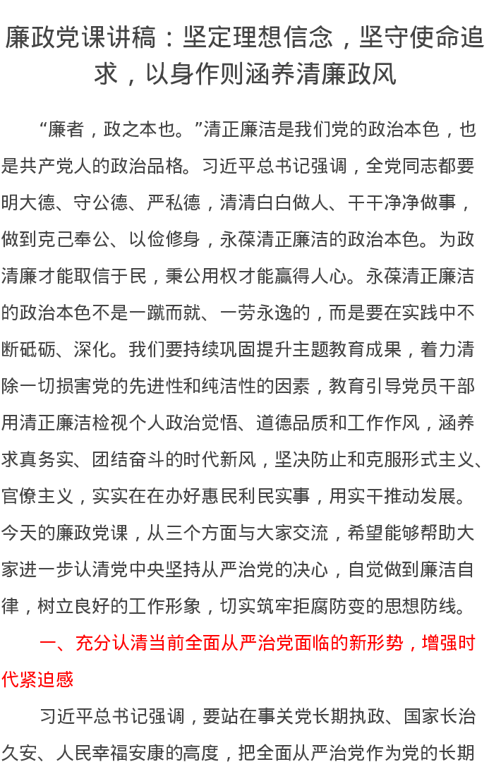 廉政党课讲稿:坚定理想信念,坚守使命追求,以身作则涵养清廉政风