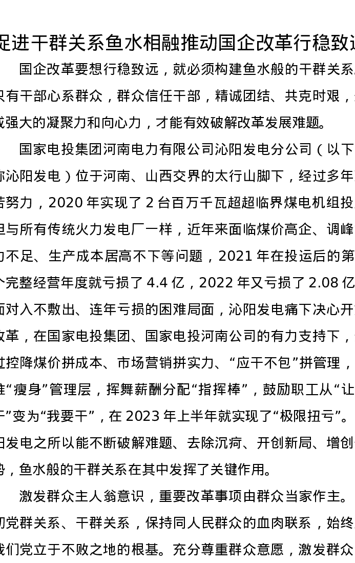 研讨发言:促进干群关系鱼水相融推动国企改革行稳致远