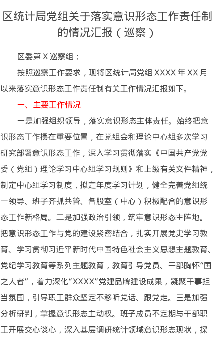 区统计局党组关于落实意识形态工作责任制的情况汇报(巡察)