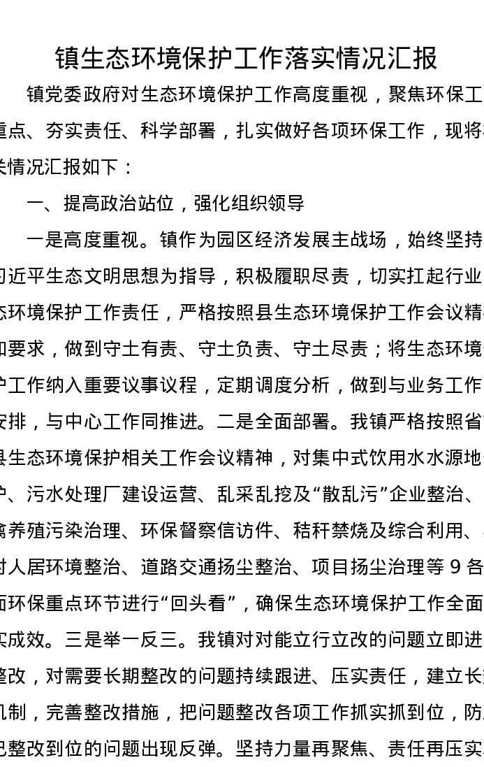 镇生态环境保护工作落实情况汇报