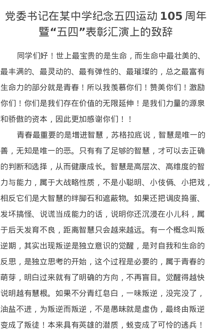 党委书记在某中学纪念五四运动105周年暨“五四”表彰汇演上的致辞