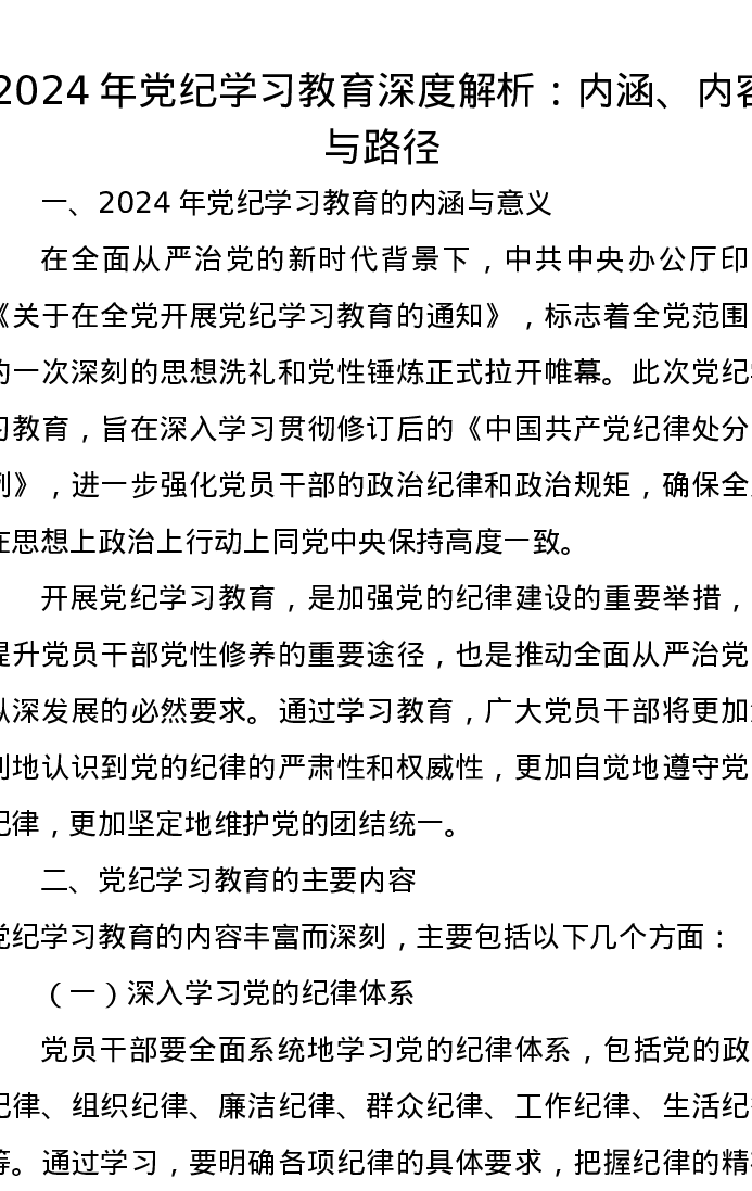 2024年党纪学习教育深度解析讲稿:内涵、内容与路径